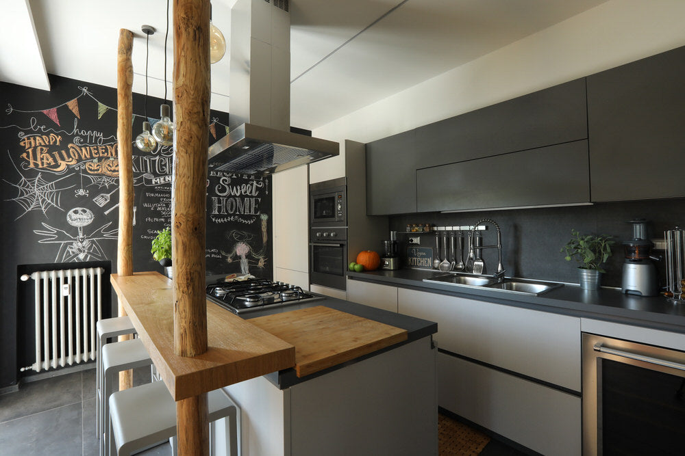 In questo progetto di ristrutturazione nel quartiere Monteverde di Roma, abbiamo trasformato un appartamento creando un open space con cucina al centro, dove la famiglia può interagire durante la preparazione dei pasti. Abbiamo incorporato uno stile industrial nei toni di grigio e legno, con un tocco di colore nella stanza del figlio maggiore e uno stile scandinavo nella cameretta della figlia minore.