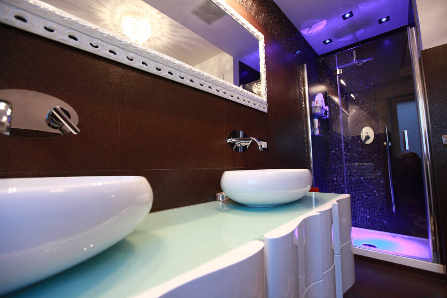 Quest’ultimo, unito al proiettore e allo schermo al plasma, ha trasformato l’ambiente in un suggestivo Home Theatre, nel quale tutti gli elementi di diffusione del suono sono perfettamente integrati nelle pareti e nel soffitto. Nella zona notte, la camera da letto si caratterizza per l’armonia dei contrasti tra i colori del parquet, delle pareti e degli arredi, ripresi dal motivo lineare che si ripete nella tappezzeria. Nella zona bagni, l’accostamento di diversi formati e finiture di gres evidenzia maggiormente la ricerca spaziale tra i vani doccia, vasca e sauna.