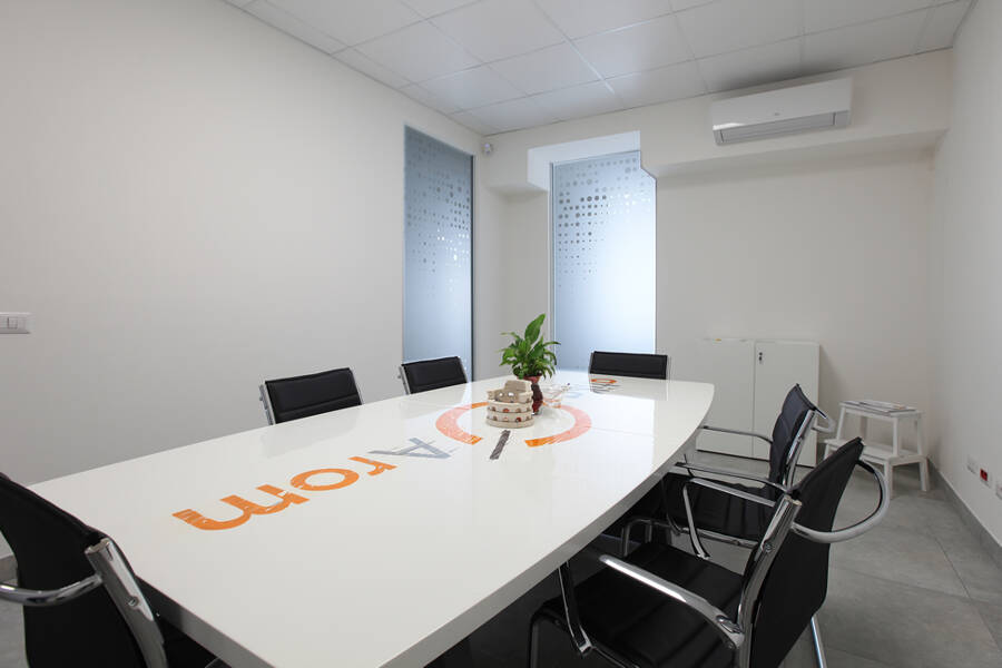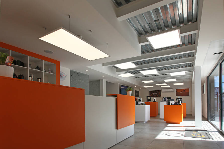 La ristrutturazione degli uffici Aromatika ha avuto l’obiettivo di comunicare la mission commerciale dell’azienda, e a tal fine è stato predisposto un ambiente vivace e di tendenza, capace di attirare l’attenzione del cliente. All’ingresso, un’area di esposizione e accoglienza mostra al cliente una parte dell’assortimento dei prodotti dell’azienda, mentre al piano superiore sono situati gli ambienti di ufficio e riunione. L’organizzazione degli ambienti su due livelli è stata possibile grazie alla realizzazione di un soppalco con struttura in acciaio, che divide l’area del capannone in due ambiti distinti, funzionali alla duplice vocazione dell’area: showroom ed esposizione da una parte, uffici e amministrazione dall’altra.