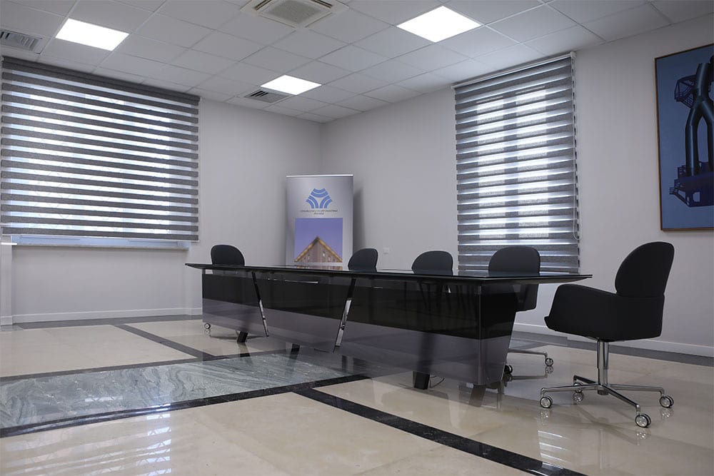 Maggiore lavoro è stato svolto nella sala conferenze e nella sala presidenziale. Per quest’ultima sono stati forniti arredi di design, quali poltrone, divano, sedie, coffee table. Abbiamo, inoltre, progettato il grande quadro a specchio con il planisfero e completato il tutto con un ampio tappeto che riprende i colori usati nella stanza.
