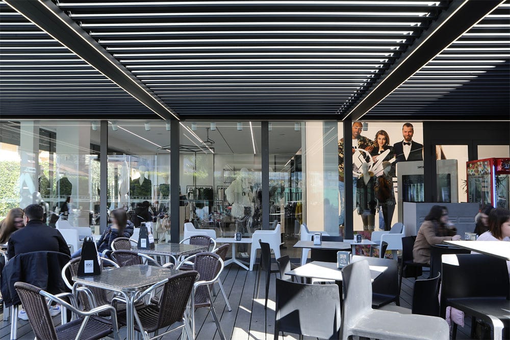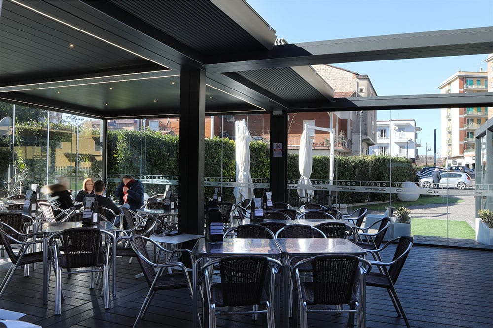 Nel progetto di via Aldo Moro a Frosinone particolare cura è stata posta nella sistemazione dello spazio esterno, catalizzatore dell’attenzione dei passanti e dunque meritevole di specifiche attenzioni progettuali. Il team di Ark Project è stato impegnato nella realizzazione di uno spazio semicoperto da un unico pergolato bioclimatico a lamelle orientabili e parzialemnte retraibili di circa 150mq con una forma a L antistante la gelateria e il ristorante 100 Montaditos, chiusa da vetrate scorrevoli totalmente invisibili, completamente integrate nella pavimentazione in decking VPC montato su sottostruttura di alluminio. L’intervento è incentrato sulla cura del dettaglio e dell’integrazione degli impianti funzionali ad uno spazio poliedrico come questo.
